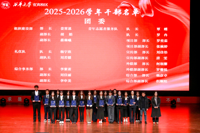 最后,全体新任干部和干事庄严宣誓,承诺将以热忱之心服务同学,恪尽职守。大会在全体参会人员的合影留念中圆满落幕。此次大会不仅顺利完成了学生组织的新老交替,更凝聚了共识,激发了干劲,为宜宾校区校园文化建设与学生组织的持续发展注入了新的活力。