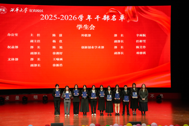 11月19日,西华大学宜宾校区2025-2026学年学生组织换届暨表彰大会在会堂顺利召开。校区党委副书记、纪委书记毕达平,党委学生工作部副部长兼宜宾校区学生工作办公室主任杨万能、各学生组织指导老师、各学院团总支老师应邀出席大会,与全体学生组织成员齐聚现场,共同见证责任传承与青春接力。