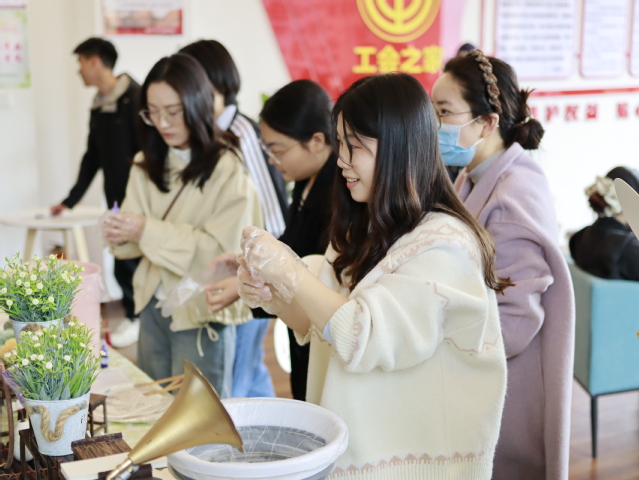 下午15:00,宜宾校区党委副书记毕达平为活动致辞,向校区女教职工致以节日的问候和美好祝福,并表示以后将开展更多形式多样、内容丰富的活动。随后,在专业老师指导下,大家手持素扇,体验浸漆、提拉、旋转技艺,充分发挥创意,将一柄柄扇子晕染出独一无二的斑斓纹理。活动现场气氛热烈、笑语盈盈,大家相互交流、分享心得。