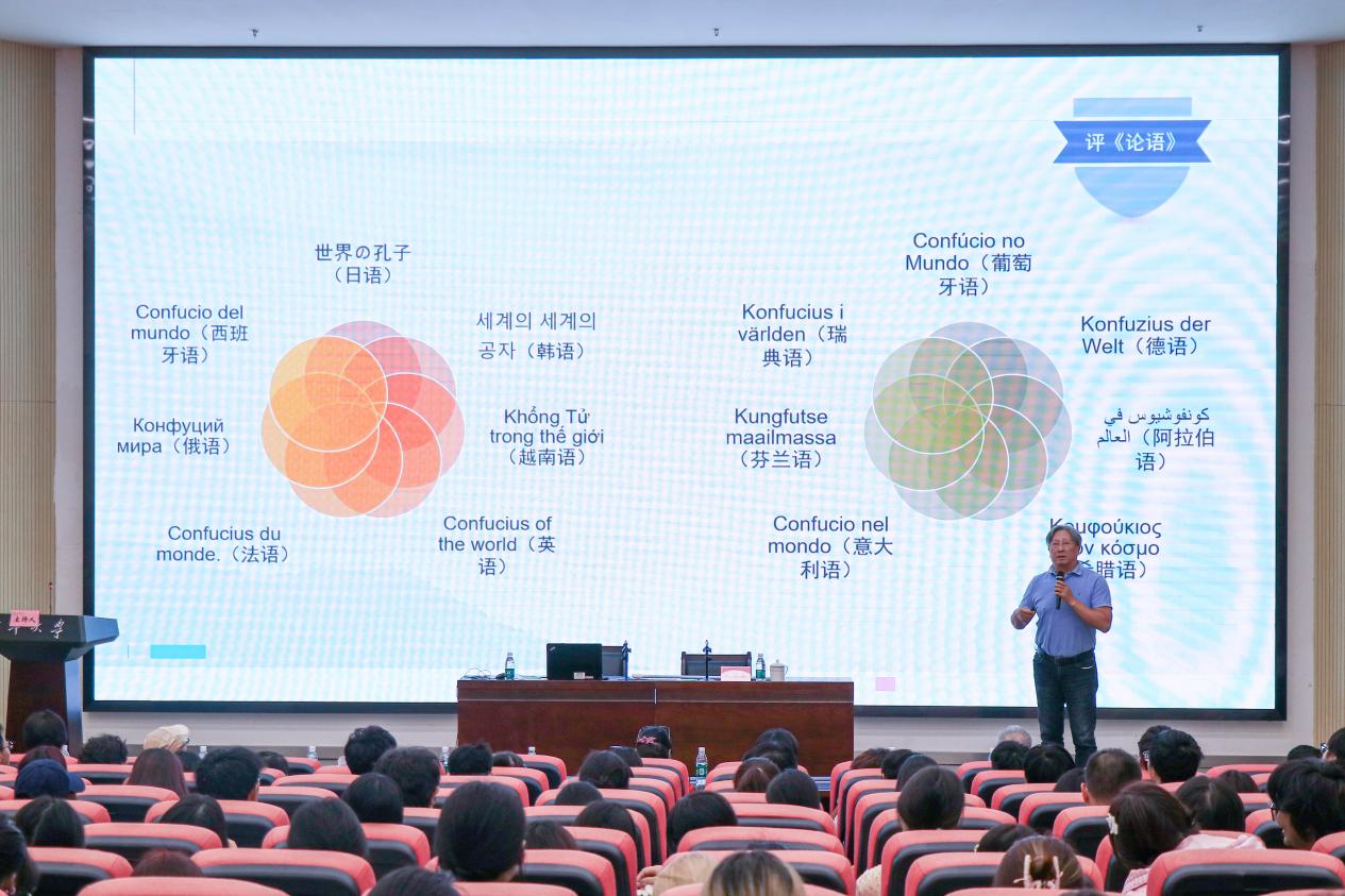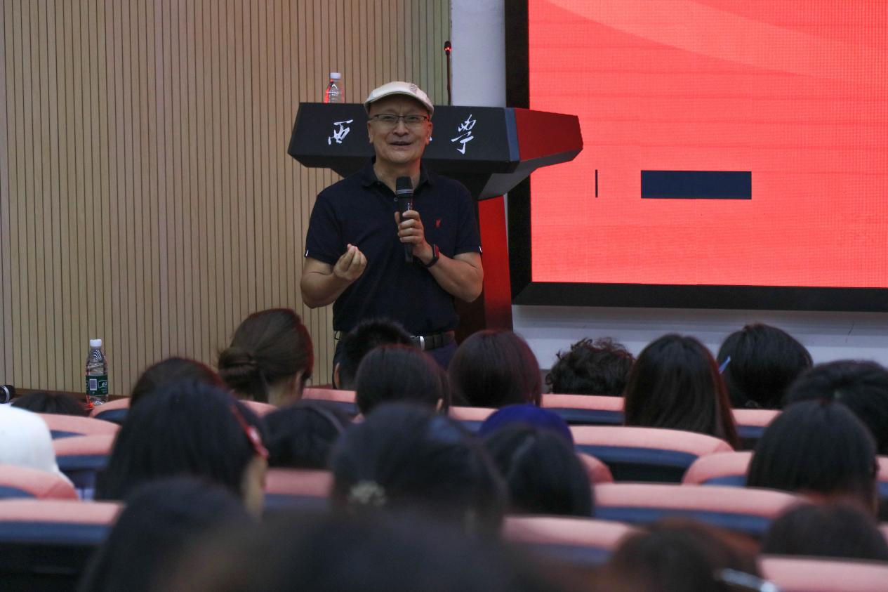 曾德祥作报告 随后,朱晋蜀教授以“我的老师孔子”为题,为大一新生带来了一场别开生面的传统文化讲座。朱教授结合自己退休后潜心研究《论语》的心得体会,深入浅出地讲解了学习《论语》的重要意义、科学方法,并生动讲述了“举一反三”、“因材施教”等经典故事,阐释其中蕴含的深刻教育理念与人生智慧。他鼓励同学们要不忘民族传统文化之根,从《论语》等经典中汲取精神养分,学会做人做事的道理,并在日常学习与实践中培养创新思维和动手能力。朱教授还分享了他致力于让更多人“花很少的时间就可以学习《论语》精髓”的初衷与努力,希望帮助青年学生轻松入门,感受中华优秀传统文化的永恒魅力。